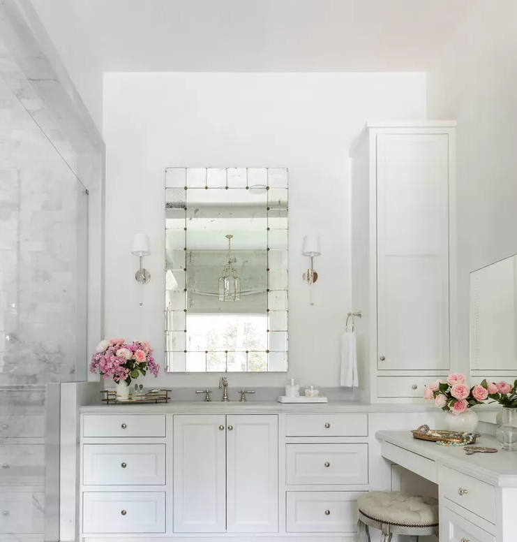 In that setup, your bathroom vanities serve not just sink and countertop functions but also become the main storage wall. To elevate the experience, you can add a lighted vanity mirror above it that will give your bathroom a more aesthetic feel.
